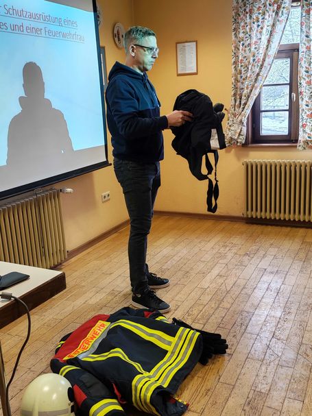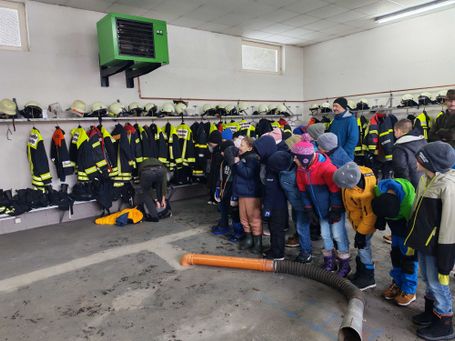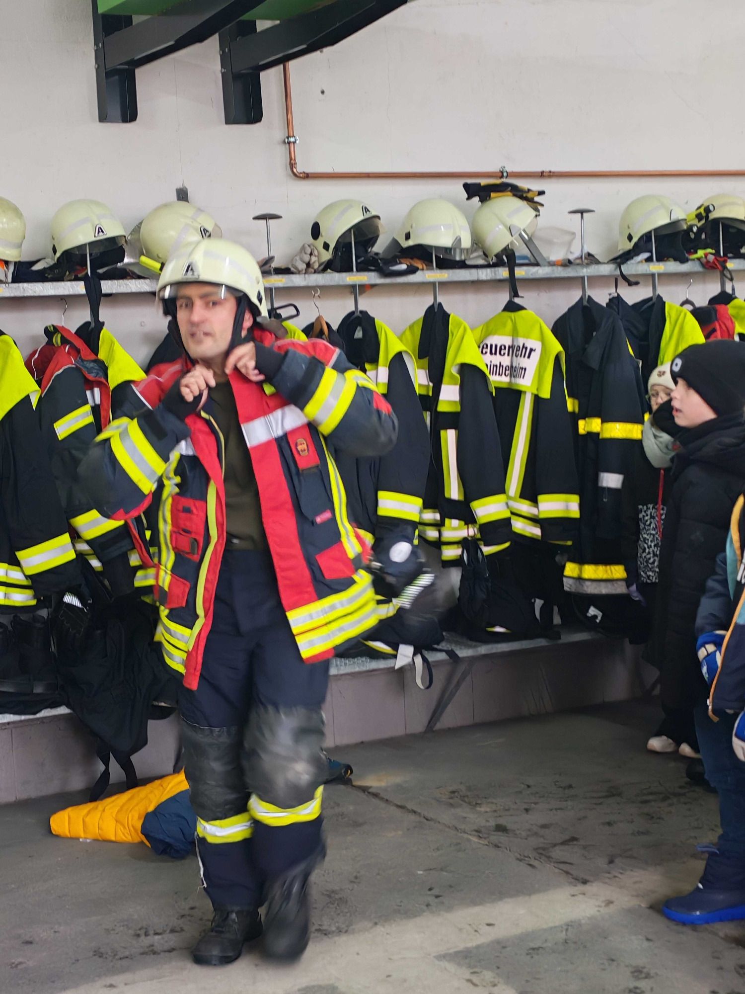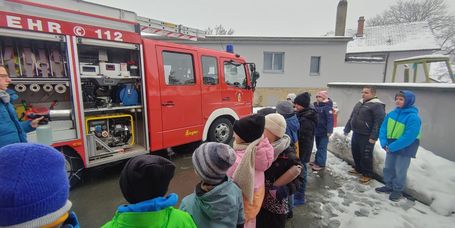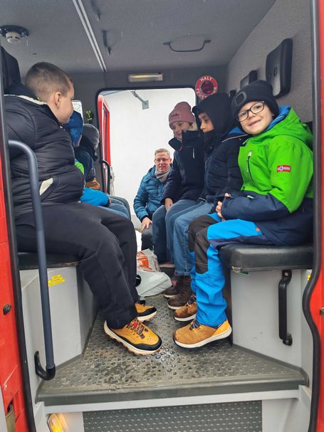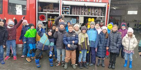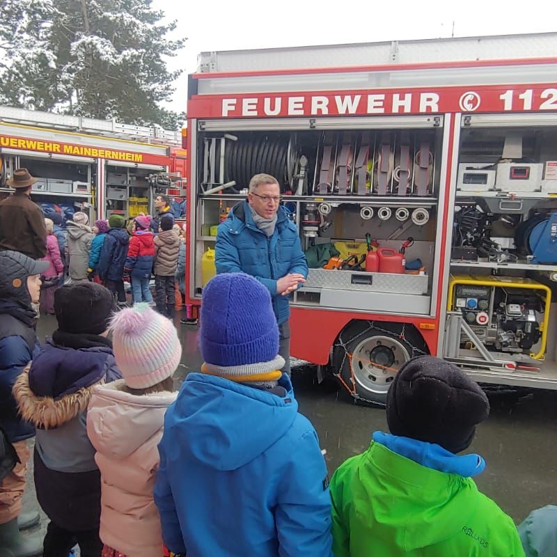 Nur eine von vielen Fragen, mit denen sich die Drittklässler der Grundschule Mainbernheim am 29.01.2026 auf den Weg zur Feuerwehr machten. Dort wurden sie bereits von Herrn Gut, Herrn Kessler und Herrn Bernhard erwartet. Zuerst gab es für alle einige wichtige Informationen im warmen Feuerwehrhaus: Was sind die Aufgaben der Feuerwehr, wie setzt man richtig einen Notruf ab, was gehört zur Schutzausrüstung und welche Löschfahrzeuge gibt es. Hier durfte natürlich auch das im Landkreis Kitzingen einzigartige „Löschgefährt“ der Mainbernheimer Lösch-Kids nicht fehlen! Richtig spannend wurde es im Anschluss in der Fahrzeughalle. Hier konnten die Schülerinnen und Schüler die zwei großen Mainbernheimer Löschfahrzeuge einmal im Detail anschauen. Zum Abschluss brachte Herr Kessler noch alle zum Staunen: Nur 20 Sekunden benötigte er, um sich in seine Feuerwehrmontur zu werfen und bereit zur Abfahrt zu sein! Vielleicht sieht man einige der begeisterten Schüler in Zukunft nun öfter bei der Feuerwehr.