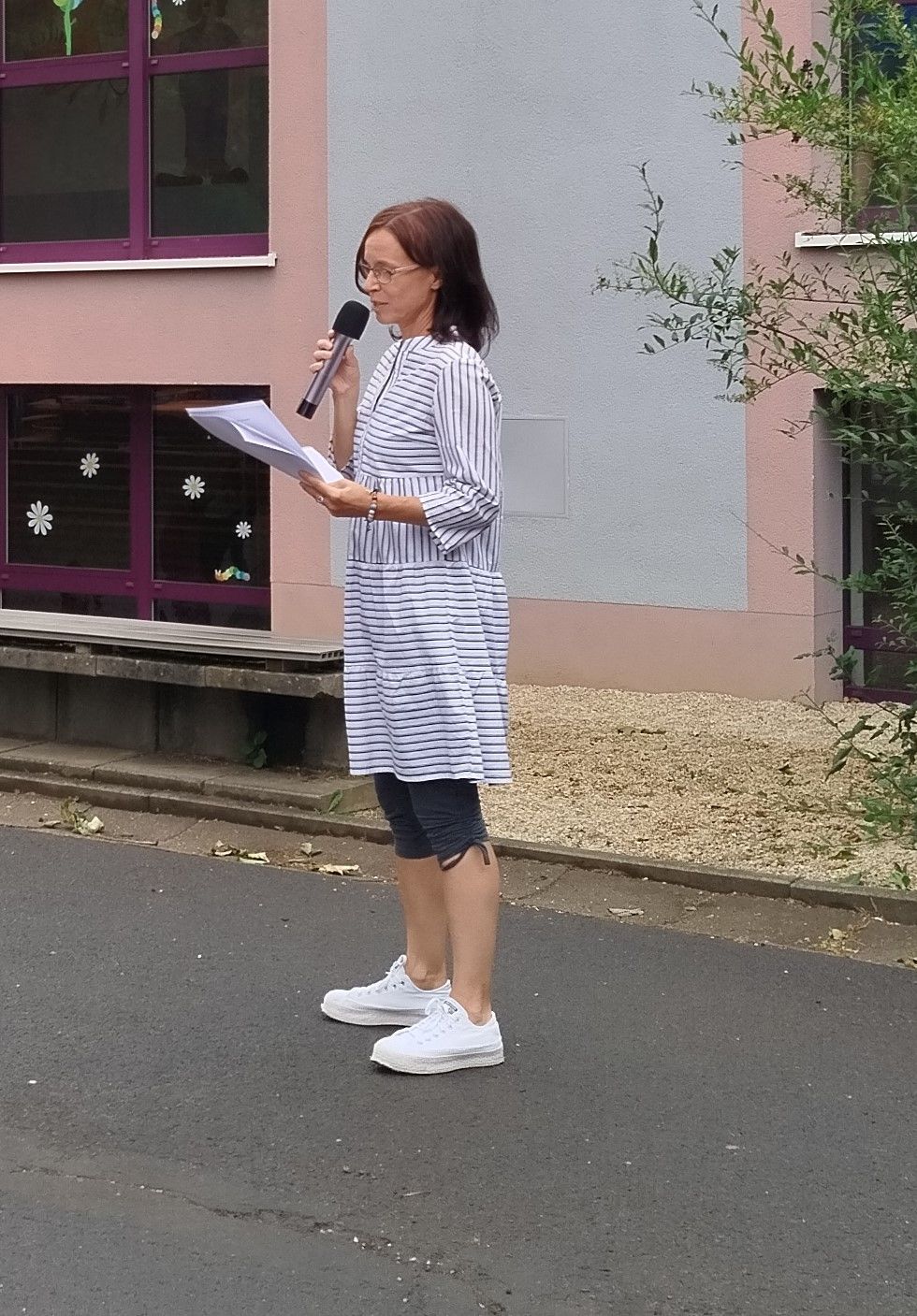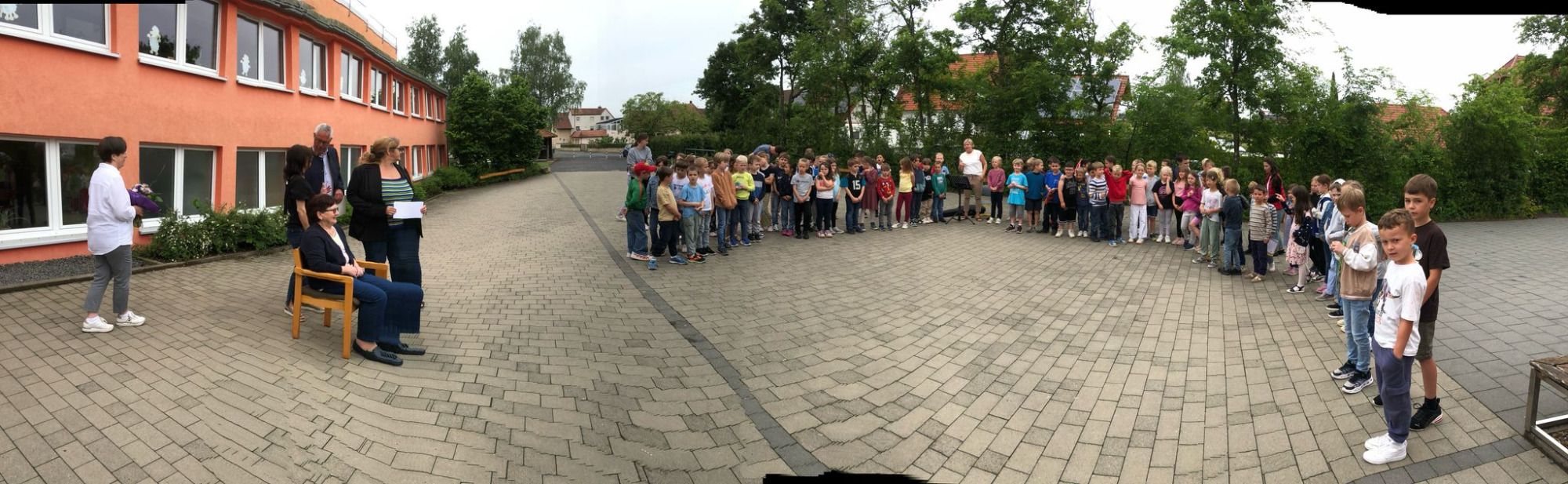 „Wenn man ins Schulhaus Rödelsee kommt, dann blitzt und blinkt alles!“, so die Worte des Schulverbandsvorsitzenden und 1. Bürgermeister der Gemeinde Mainbernheim Kraus. Dies verdanken wir Elisabeth Dotterweich, die am 1. Juni ihr 25. Dienstjubiläum als Teil des Reinigungsteams im Schulhaus Rödelsee feiern durfte. Durch ihr umsichtiges Mitdenken und Engagement im Schulhaus Rödelsee sorgt sie für ein Wohlfühlklima bei Schülern, Eltern und Lehrern. Da sie dies immer mit einem freundlichen Lächeln tut, sangen ihr die Kinder der 1. und 2. Klassen auf dem Pausenhof das Ständchen „Dein Lachen macht mich glücklich“ und sie bekam von Herrn Bürgermeister Kraus im Namen des Schulverbandes einen hübschen Blumenstrauß und die offizielle Urkunde überreicht.