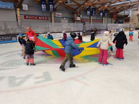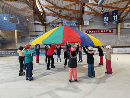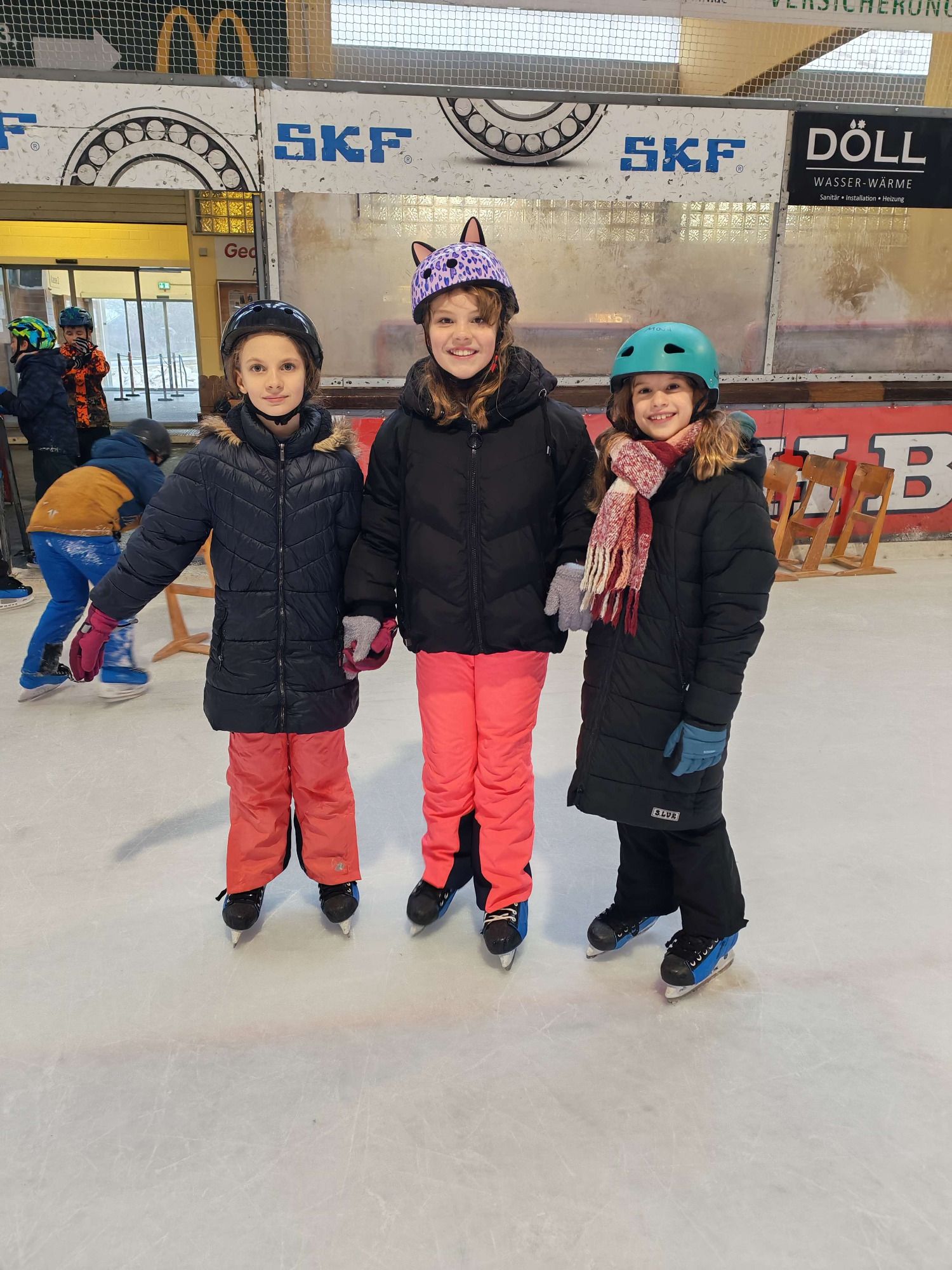 Am 15. Januar 2026 war es wieder soweit: Die Dritt- und Viertklässler der Grundschule Mainbernheim machten sich auf den Weg in die Eishalle nach Schweinfurt. Für einige Kinder waren es mit ihren Klassenlehrerinnen und Klassenlehrern die ersten Versuche auf dem Eis, andere Kinder waren schon richtige Profis auf den Kufen. Auch einige Eltern fanden sich wieder auf der Eisfläche ein um mitzumachen und die Lehrkräfte zu unterstützen. Spaß gab es aber für alle: Spiele mit dem Fallschirm, Parcour fahren oder sogar Eishockey spielen. Wer noch unsicher war, konnte sich auch Stühle als Gleithilfe nehmen. Nach 2 Stunden machten sich alle wohlbehalten und zufrieden auf den Rückweg in die Schule.
