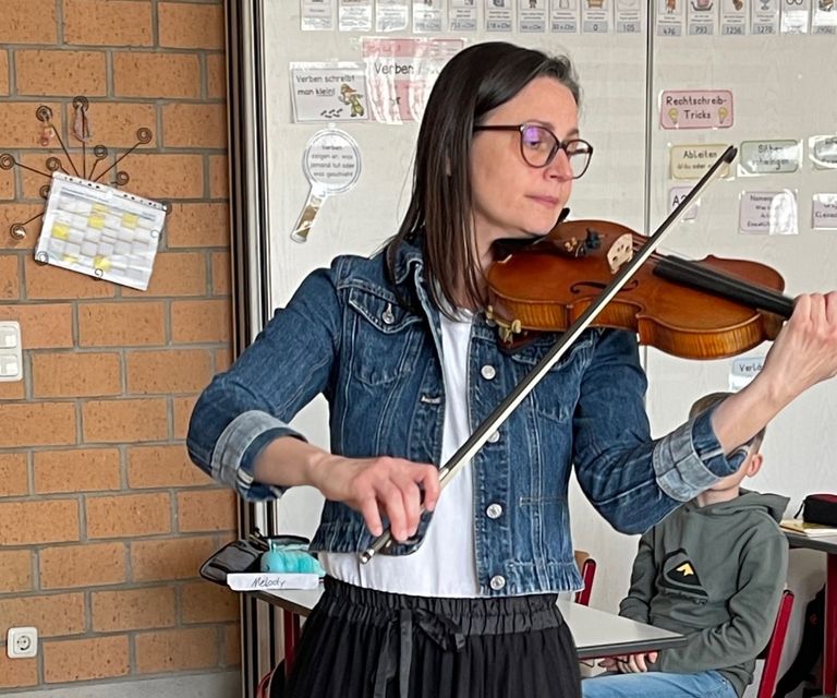 Frau Eitel-Nasoetion besucht unsere 4. Klassen im Musikunterricht und stellt ihre Geige vor. Wir lernen die Teile einer Geige kennen, erfahren, wie teuer und besonders wertvoll dieses Instrument sein kann und bekommen ein kleines Vorspiel.