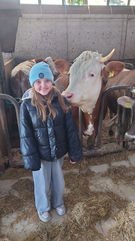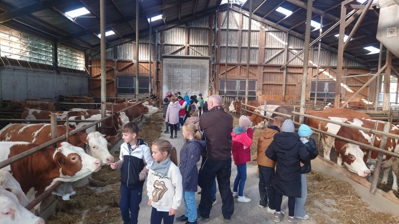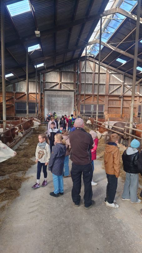Die beiden vierten Klassen machten sich bei schönstem Wetter am 2. Oktober auf nach Willanzheim zum Bauernhof der Familie Drobek. Es wurden viele Kühe gestreichelt, die Melkanlage bewundert und der Traktor beim Abholen des Futters bestaunt.