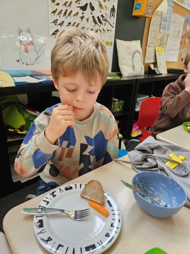 Mit Hilfe der Lehrkräfte zauberten die Kinder ein leckeres Frühstückbuffet mit Müsli, Obstspießen, Honig- und Schnittlauchbroten und Gemüsesticks. Frau Heß brachte Fair-Trade-Snacks mit und ließ die Kinder von köstlichem Tee probieren. Außerdem durften sich die Kinder Apfelsaft schmecken lassen.